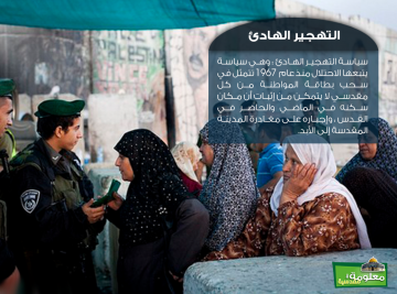 سياسة التهجير الهادئ: هي سياسة يتبعها الاحتلال منذ عام 1967 تتمثل في سحب بطاقة المواطنة من كل مقدسي لا يتمكن من إثبات أن مكان سكنه في الماضي والحاضر في القدس، وإجباره على مغادرة المدينة المقدسة إلى الأبد.