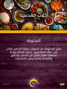تعتبر "المدلوقة" من الحلويات سهلة التحضير، والتي تزين موائد المقدسيين بجمال ألوانها وروعة مذاقها، فهي تتكون من السميد والدقيق والقشطة والنشا وتزين بالمكسرات.