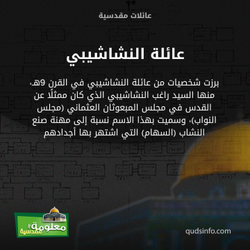 برزت شخصيات من عائلة النشاشيبي في القرن 9هـ، منها السيد راغب النشاشيبي الذي كان ممثلًا عن القدس في مجلس المبعوثان العثماني (مجلس النواب)، وسميت بهذا الاسم نسبة إلى مهنة صنع النشاب (السهام) التي اشتهر بها أجدادهم.