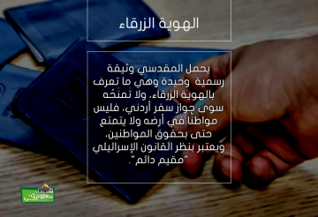 يحمل المقدسي ما يسمى بالهوية الزرقاء، وهي الوثيقة الرسمية الوحيدة التي يحملها المقدسي العربي، ولا تَمنَحُه سوى جواز سفر أردني، فلا مواطنًا في أرضه ولا يتمتع حتى بحقوقهم، بل يعتبر بنظر القانون الإسرائيلي "مقيم دائم".
